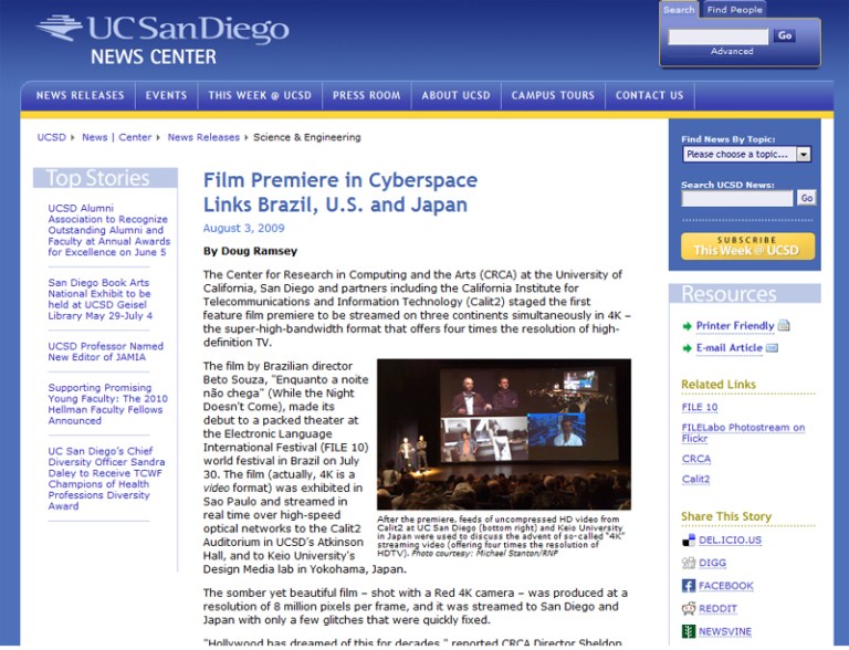 20 de setembro de 200920 de setembro de 2012 FILE TRANSCONTINENTAL 2009 A witz cultural foi uma das produtoras da primeira transmissão de um filme em ultraresolução (4K) para dois países ao mesmo (EUA e Japão) durante do FILE (Festival Internacional de Linguagem Eletrônica) de 2009. Compartilhe isso: Clique para compartilhar no X(abre em nova janela) 18+ Clique para compartilhar no Facebook(abre em nova janela) Facebook Curtir Carregando... Relacionado
